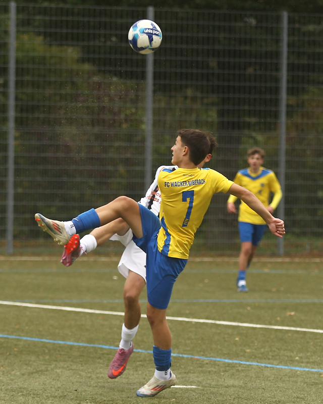 Trotz der Außenseiterrolle war Wackers Trainerteam vorab klar, dass was möglich ist, wenn die Mannschaft fußballerisch und vor allem einsatztechnisch gegen den Ball alles reinhauen würde. Und ihre Jungs starteten auch wie die Feuerwehr: Schon nach 30 Sekunden hatte jeder den Torschrei auf den Lippen, als Maxi nach einem hohen Ballgewinn auf Rafa (Foto Nr. 7) ablegte und dieser alleine vor dem Berger Torwart stand, der aber eine unfassbare Parade aus dem Hut zauberte.