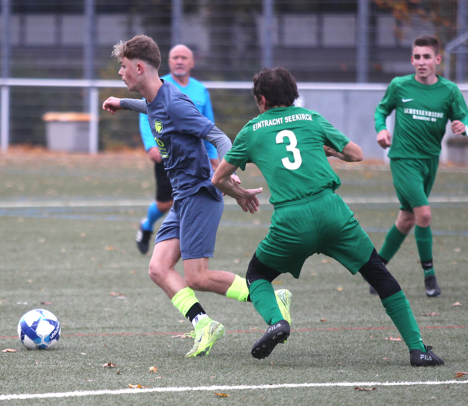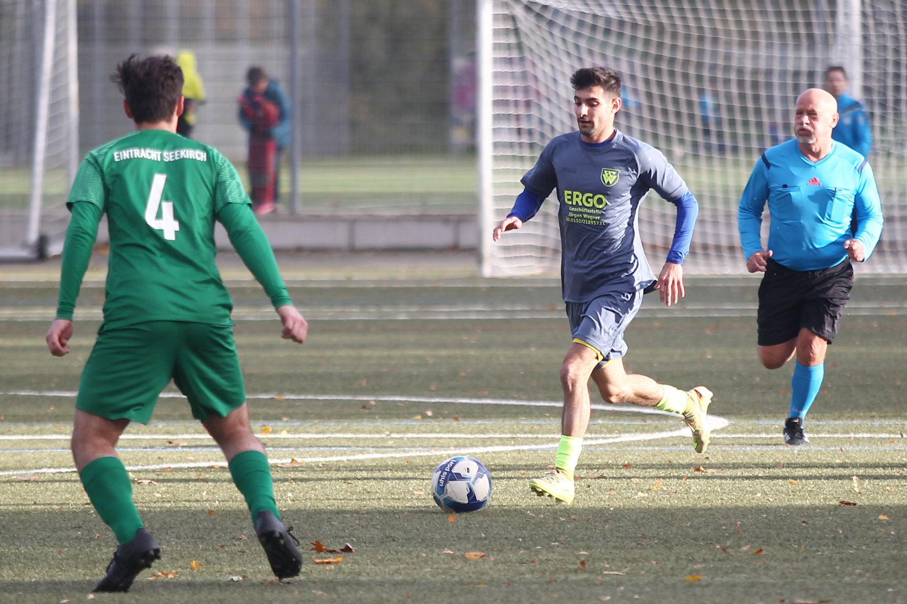 Unsere Männer dominierten in der ersten halben Stunde das Spiel in allen Belangen, ja schon fast nach Belieben. Sie ließen Ball und Gegner geschickt laufen und stürzten mit einer wohldotierten Mischung aus Kurzpass- und vertikalem Spiel die Gäste immer wieder in Verlegenheit. Technisch und spielerisch klar überlegen, wesentlich (handlungs-)schneller als die Seekircher starteten sie immer wieder gefährliche, zumeist über die Außenbahnen vorgetragene Angriffe. Zwei dieser "Attacken" führten zu Toren: in der 12. Minute zum 1:0 durch Jakob Kolesch (nach sauberer Vorlage von Mehmet Sahin) und in der 21. Minute zum 2:0 durch den unermüdlichen Marius Häußler (nach klugem Rückpass von Tim Scherff).