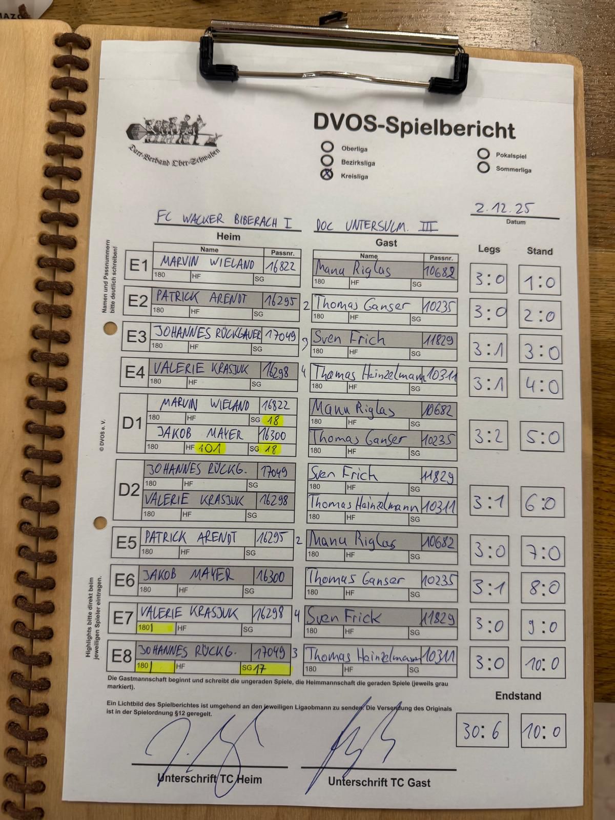 Der FCW dominierte von Anfang an, gewann alle Einzel und ging mit 4:0 in Führung. Im ersten Doppel drehten Jakob & Marvin dann einen Rückstand und besiegelten ihren Sieg mit einem 101 Highfinish zum 18 Darter. Das zweite Doppel gewannen unsere Männer ebenso souverän, wodurch sie auf 6:0 erhöhten und den Tagessieg klar machten.