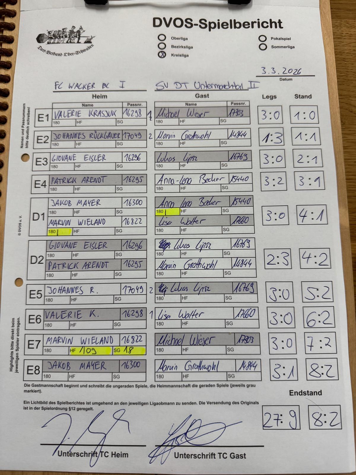 In den Einzeln entwickelten sich enge Partien, nach denen der FCW aber mit 3:1 führte. Nach den beiden Doppelspielen stand es 4:2, dabei gelang Marvin seine zweite 180 in dieser Saison.