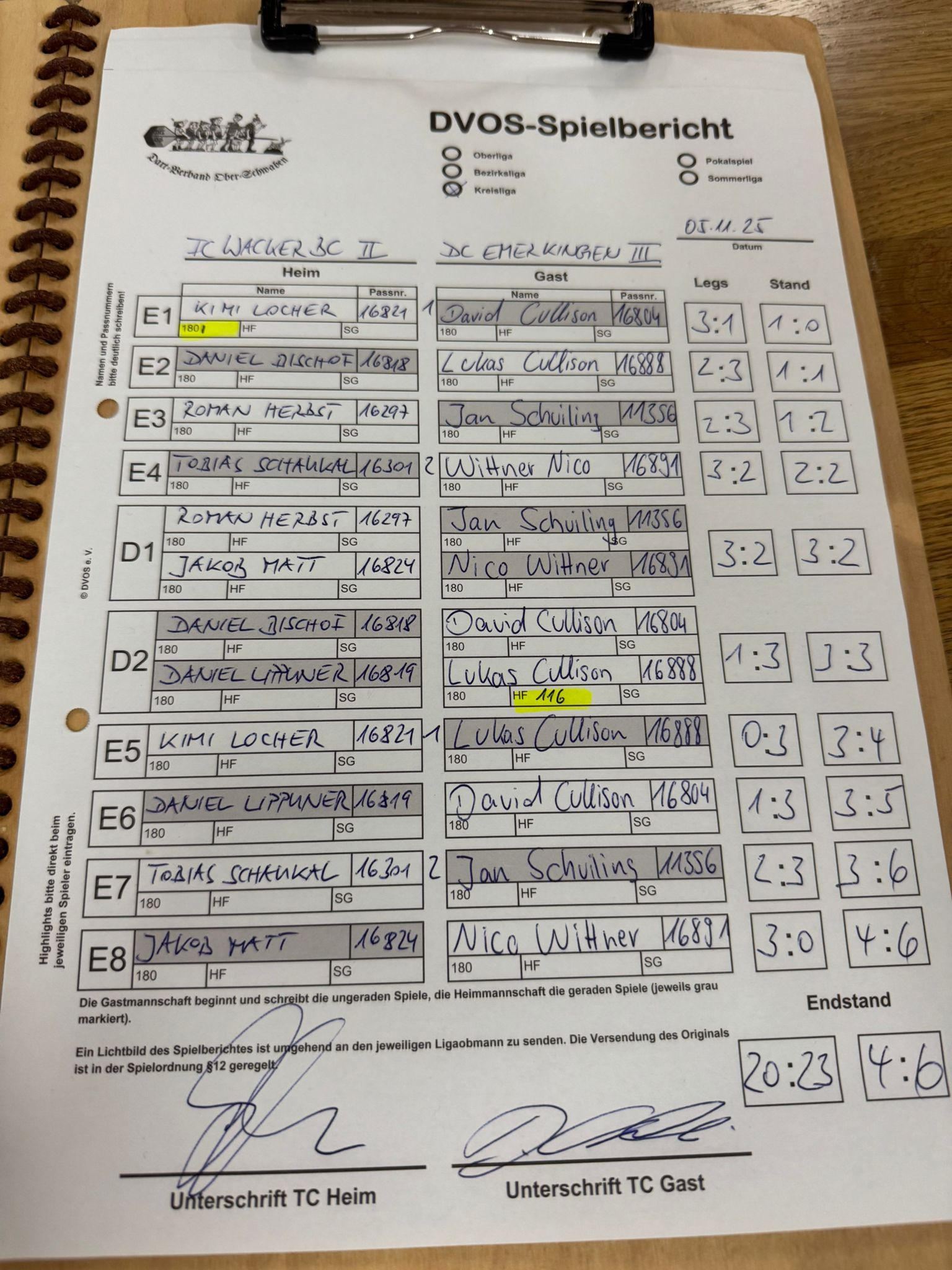 In den entscheidenden Spielen war der Gegner in den Checkdarts einfach stabiler. Für das einzige Highlight bei den Unseren sorgte Kimi mit seinen 180 im ersten Spiel, bereits seine fünfte in dieser Saison!