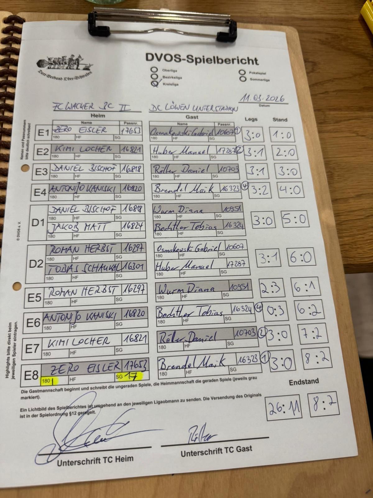 Die nächsten beiden Einzeln wurden verloren, ehe Kimi und Zero ihre Klasse zeigten und mit jeweils 3:0 gewannen. Zero gelang dabei eine 180 und ein 17-Darter.
