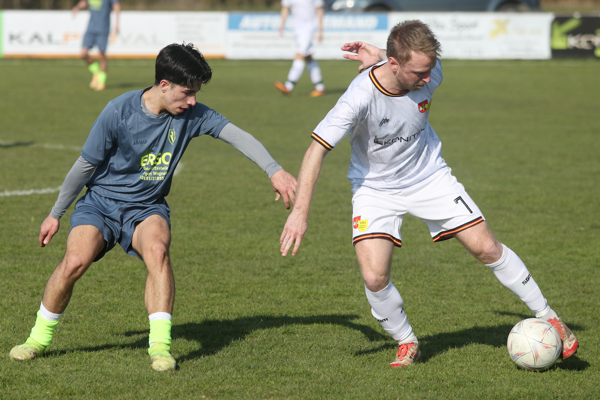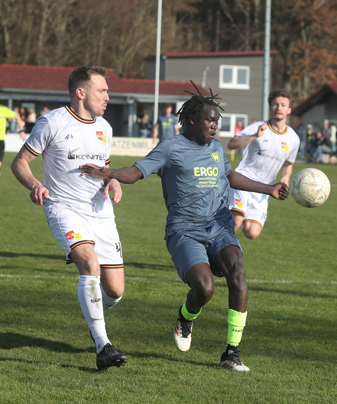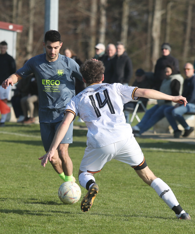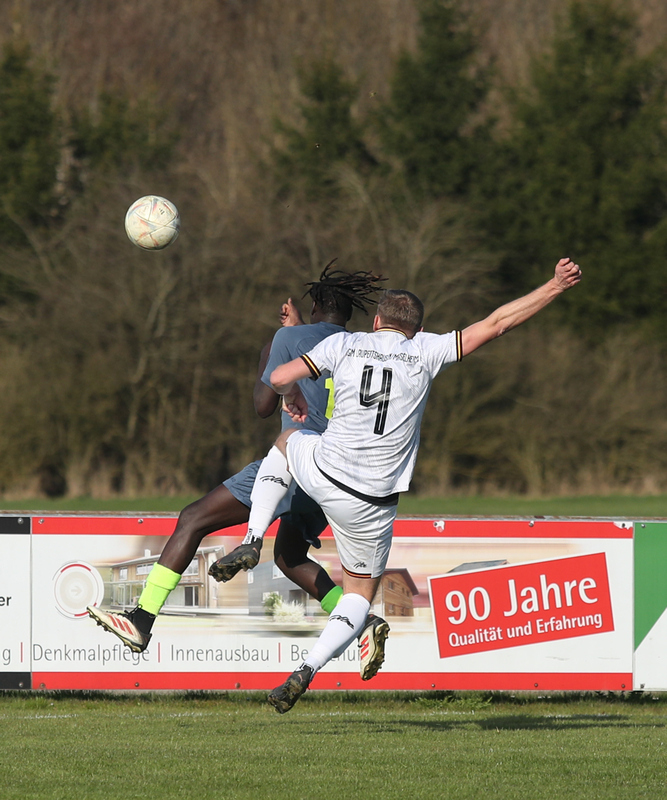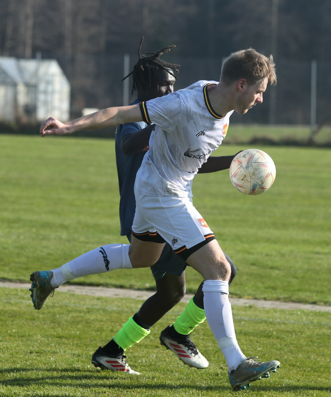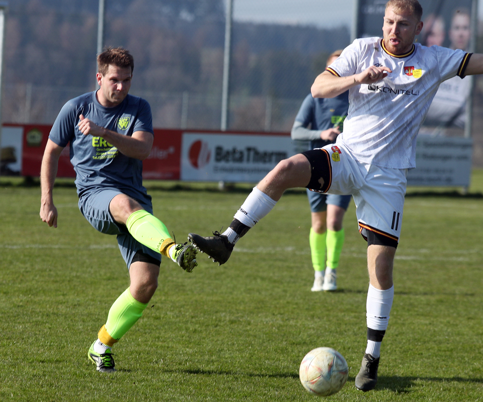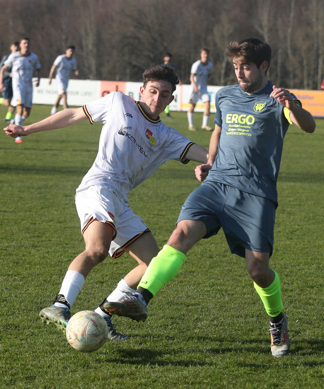 Nach dem Seitenwechsel steigerten sich unsere Männer und passten ihre Spielweise den Platzverhältnissen an. So kamen sie zu zwei hundertprozentigen Torchancen, die von Mircha David Gach (53./vorn im Bild) und Jakob Kolesch (83.) aber vergeben wurden - somit auch die Gelegenheit, dem sehr zerfahrenen Spiel (vielleicht?) eine Wende zu geben. Nachdem die Einheimischen auch noch die eine oder andere gute Einschuss-Gelegenheit liegen ließen, blieb es beim 2:0.