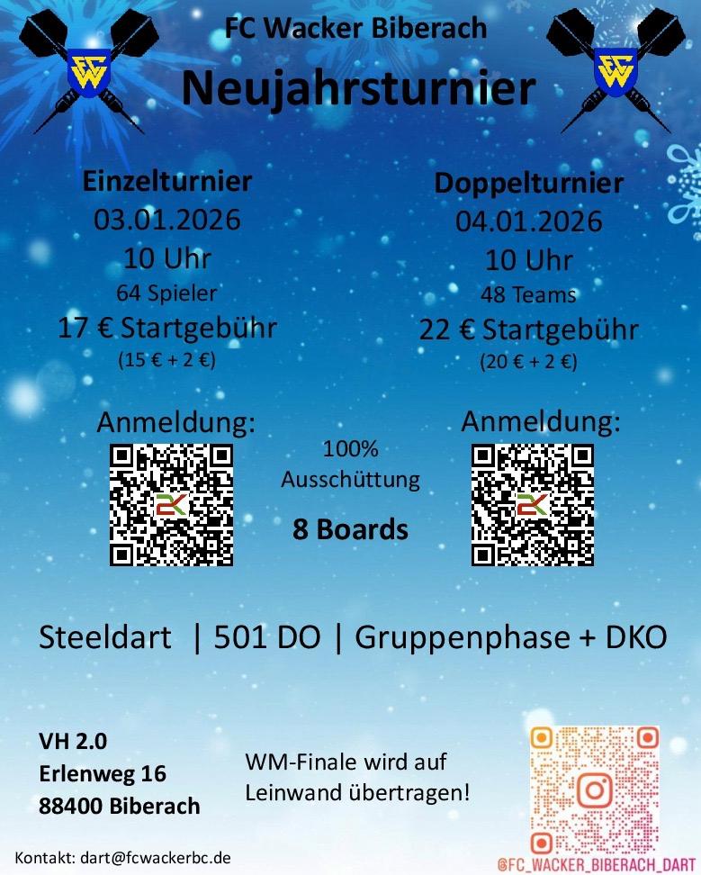 Am Samstag, 3. Januar und Sonntag, 4. Januar 2026 steigt das dritte Steeldart-Turnier des FC Wacker im Vereinsheim (VH 2.0).
