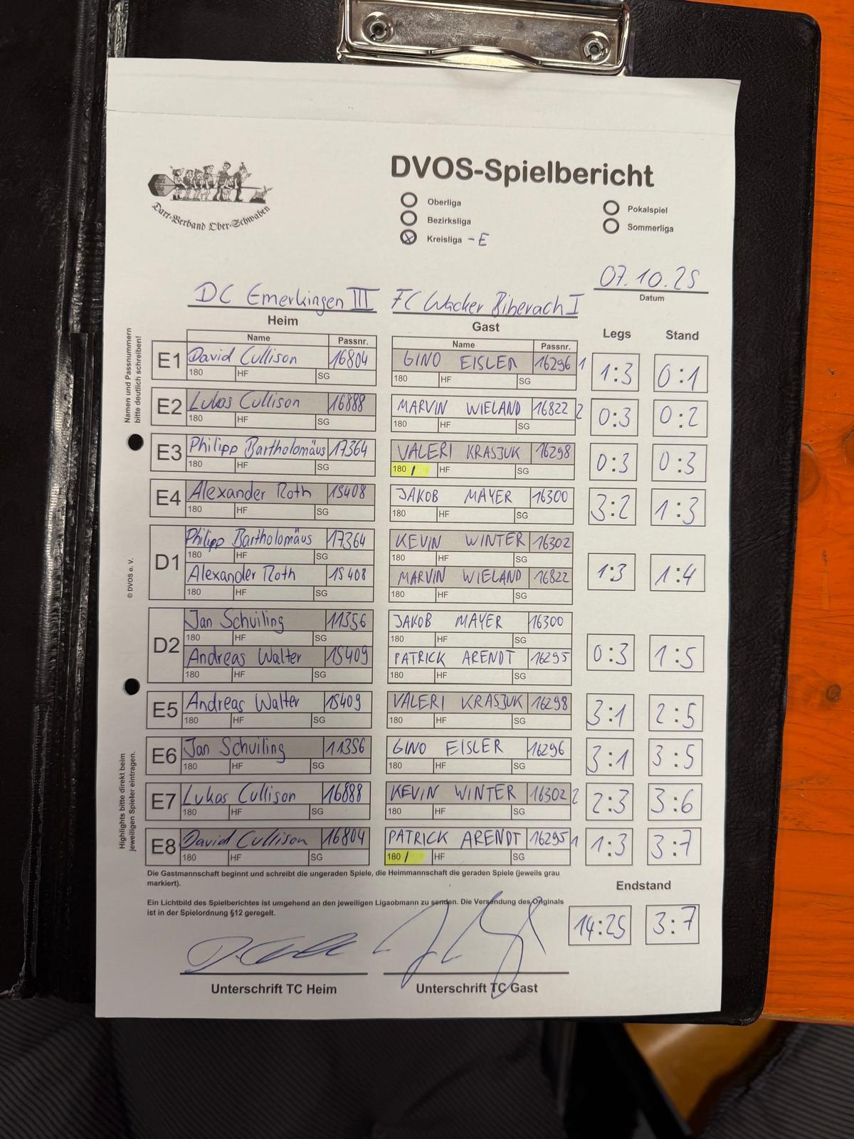 Leider schlichen sich in den folgenden Einzelspielen vermehrt Fehler ein, so dass Emerkingen auf 5:3 verkürzen konnte. In den letzten beiden Einzelspielen brauchte es also mindestens einen Sieg, um zwei Punkte mit nach Biberach zu nehmen. Patrick und Kevin behielten kühlen Kopf, bewiesen Nervenstärke und sorgten für den 7:3-Sieg. Dabei gelang auch unserem Patrick die erste 180 in dieser Saison!