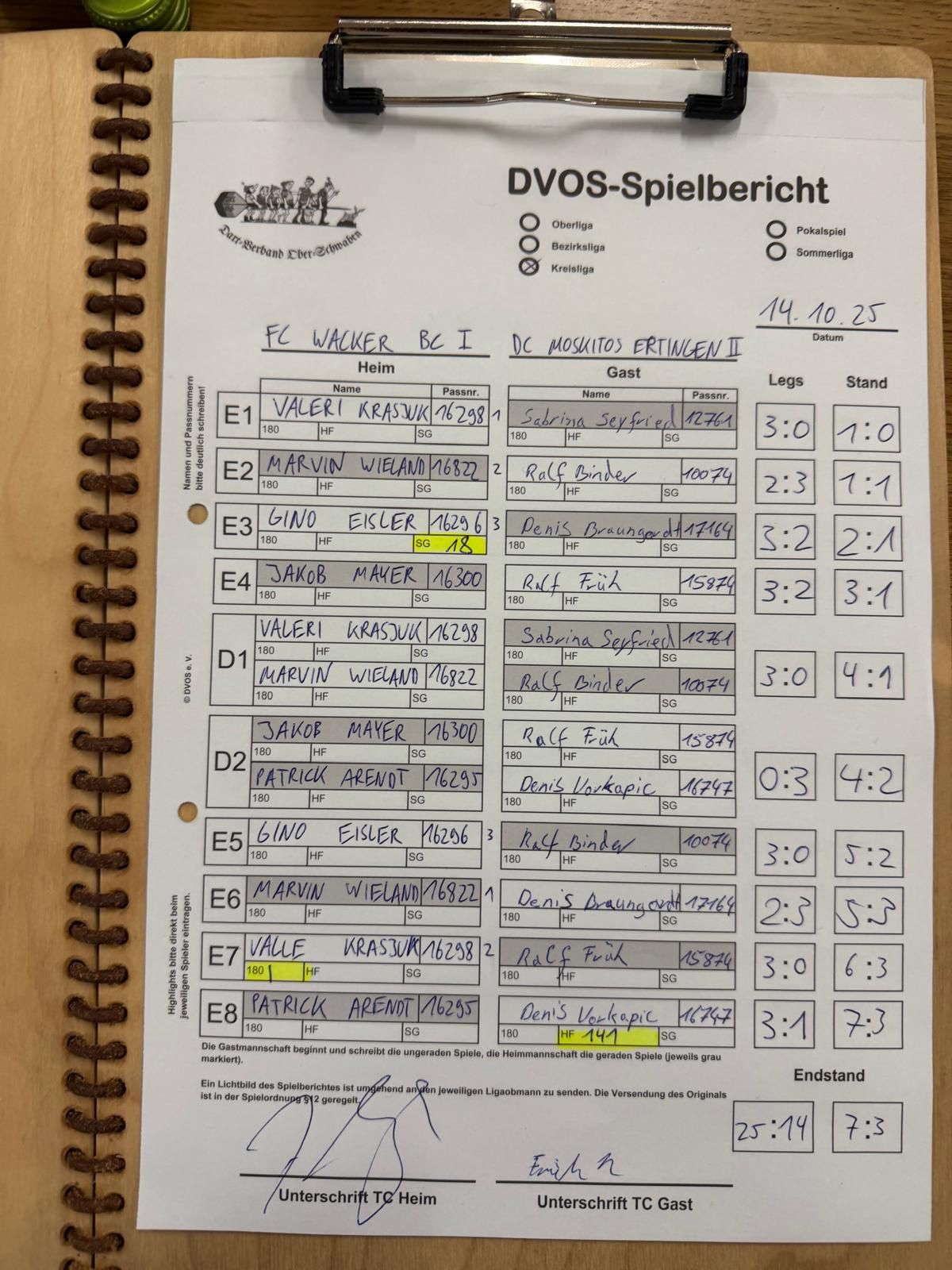 Nach den beiden Doppelspielen führte der FCW weiterhin, mit 4:2. Darauf folgten zwei Spiele, die in beide Richtungen hätten kippen können. Der FCW erhöhte aber auf 5:3 und benötigte somit nur noch einen Sieg, um erneut zwei Punkte einzufahren. Sowohl Patrick als auch Vale behielten kühlen Kopf, bewiesen Nervenstärke und sorgten für den 7:3-Endstand. Dabei schaffe Vale seine zweite 180.