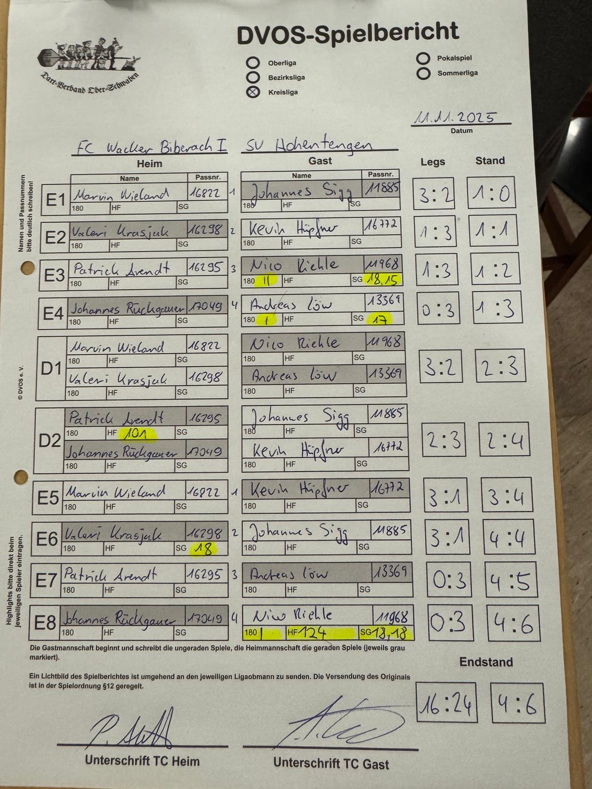 (ge) - Am sechsten Spieltag der Kreisliga E hat die erste Mannschaft unserer Darter (2.) gegen Spitzenreiter SV Hohentengen I mit 4:6 verloren.