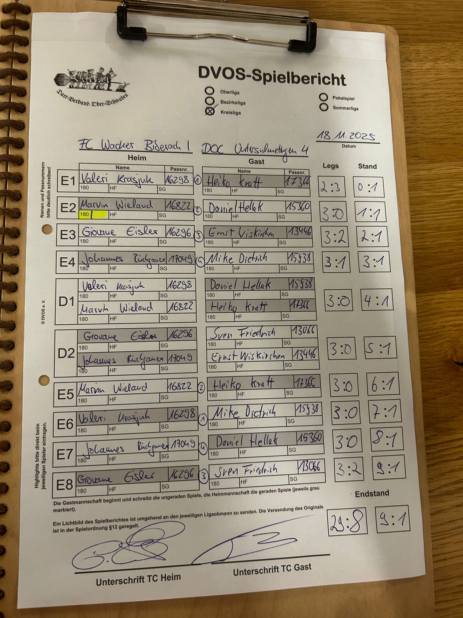 Die ersten beiden Partien verliefen aber ausgeglichen, sodass es 1:1 stand. Dabei gelang unserem Marvin seine erste 180 in dieser Saison. Die anschließenden Einzel und auch die beiden Doppel wurden dann klar gewonnen, sodass der FCW mit 5:1 in Führung ging.