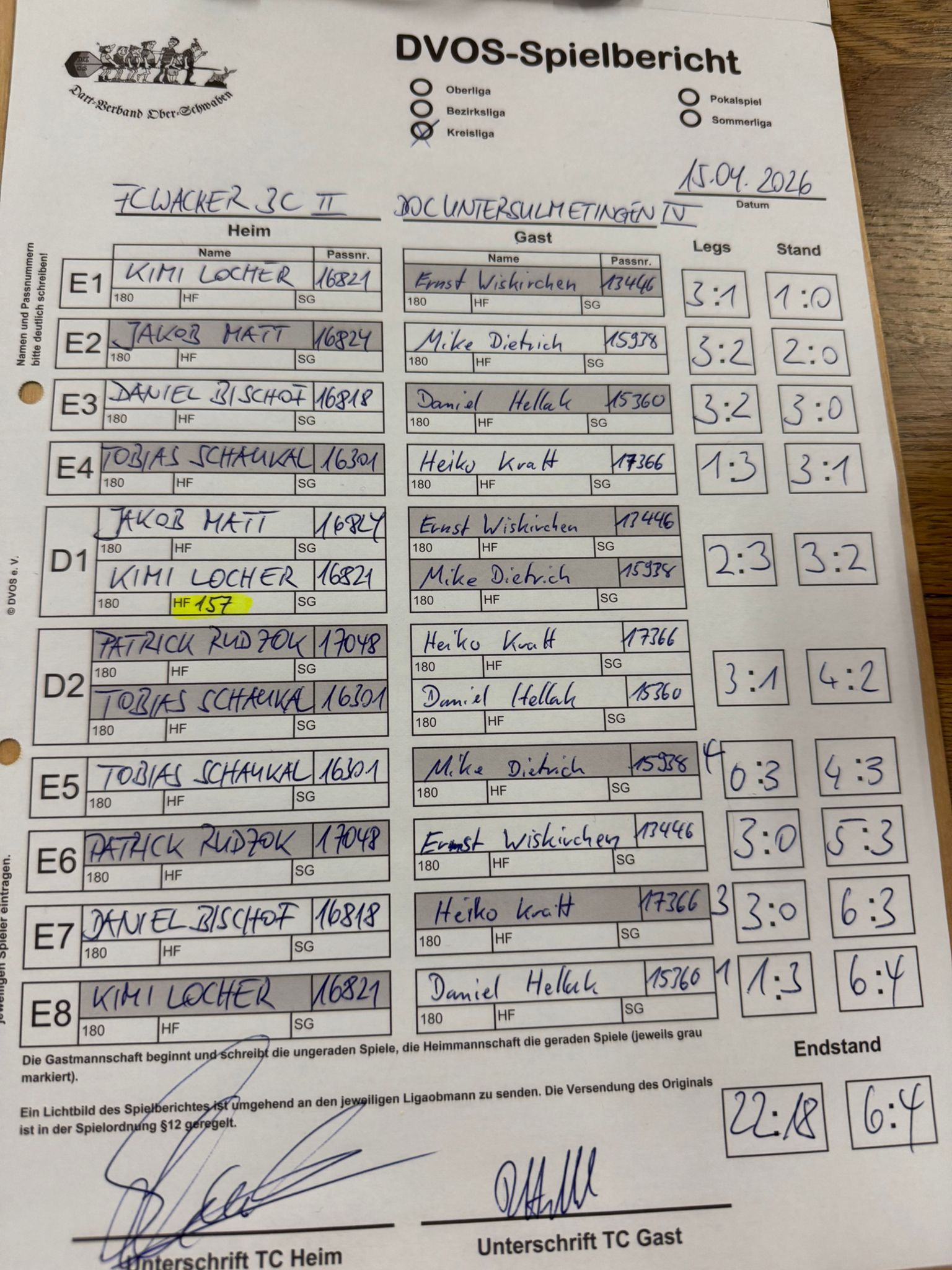 (ge) - Ein enges und spannendes Spiel hat die zweite Mannschaft unserer Darter gegen den DOC Untersulmetingen IV mit 6:4 für sich entschieden.